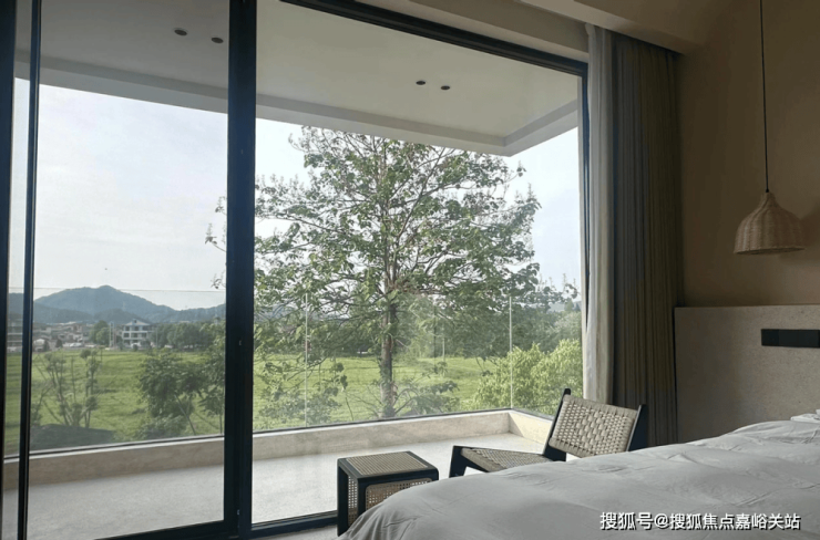 在卧室透过落地玻璃门望向户外,让人心情变得开朗,这得益于乡村的自然风光。