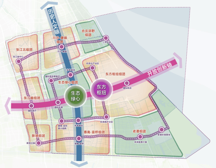 根据《东方枢纽及周边地区专项规划(2025-2035年)》,东方枢纽将串联周边板块,形成“一心两轴、双环四翼、九组团”开放、棋盘式的总体空间格局。