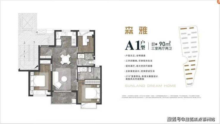A1户型:建筑面积约90㎡三室两厅两卫