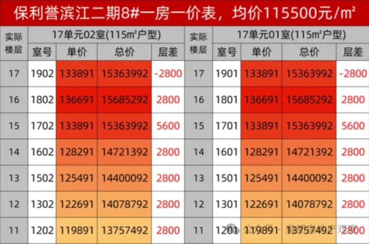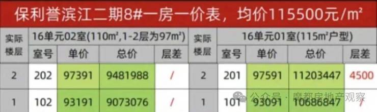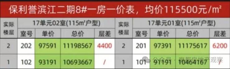 再看价格优势更加明显,按11.55万/㎡的均价计算115㎡户型,实得面积105㎡,以多出的实际面积计算,则最终实得单价在9.48万元/㎡(11.55*0.75*115/105=9.48)。而目前市面上与保利誉滨江坐拥相似江景的项目(常规得房率75%)最低单价也在13.5万元/㎡以上。这就意味着项目之间看似一平米2-6万的价差,实得单价差距则高达4-8万!再到总价更是以百万计的成本差距!