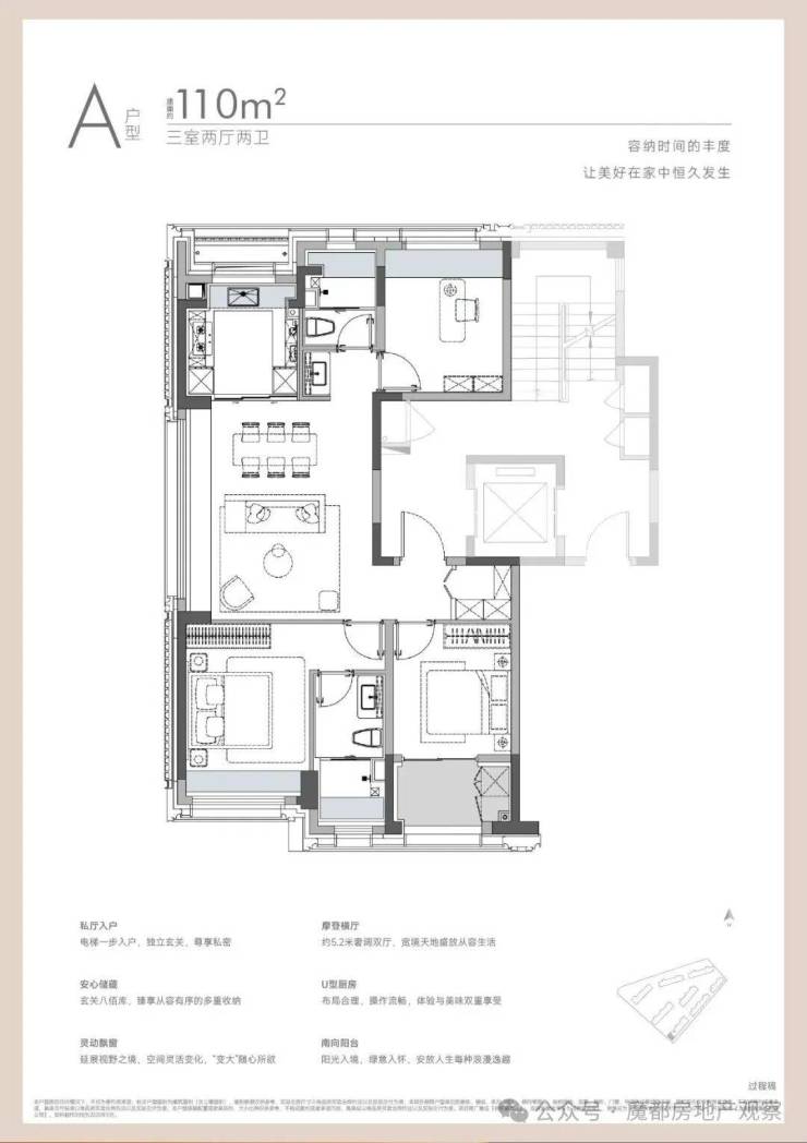 约110㎡雅致三房是首改客群的“功能王”,实得率超90%,实际面积近100㎡。约5.2米宽的双厅连着景观阳台,推开窗就是江景,日常采光和视野都很好;