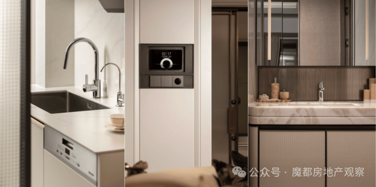 在精装标准上,该户型更是诚意满满的顶格配置:卫浴空间配备唯宝智能卫浴与高仪花洒系统,厨房搭载美诺4件套(燃气灶具、吸油烟机、烤箱、洗碗机)及博世冰箱,霍尼韦尔新风系统、日立/东芝空调地暖三大件也全部配齐,带来星级酒店般的舒适体验,而华为全屋智能系统的智能化升级则将诸多顶级硬件完美互联,真正实现奢华与便捷兼顾的的生活质感!