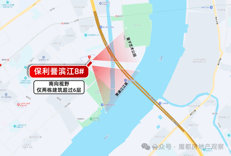 当然,江景房的核心终究是“视野”,保利誉滨江8号楼能称得上“景观楼王”,在视野上绝对下足了功夫。这栋楼位于项目南侧,是唯一能正面对江的小高层楼栋,规划待遇和社区叠墅齐平,南向没有任何高层遮挡,直线距离黄浦江仅500米,站在室内就能直面黄浦江壮阔江面!