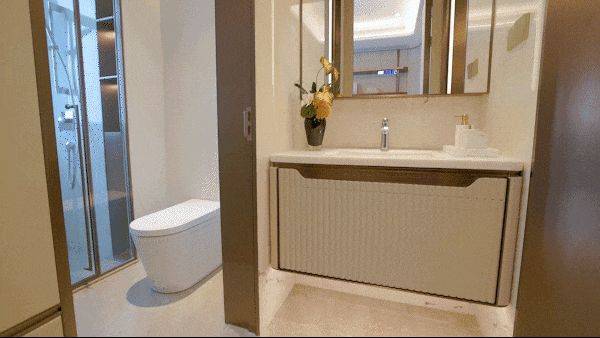 踢脚线全包的处理,看似简单,实则蕴含着对细节的追求。镜柜与门楣到顶的设计,拉伸了空间的视觉高度,让整个空间显得更加开阔、通透。