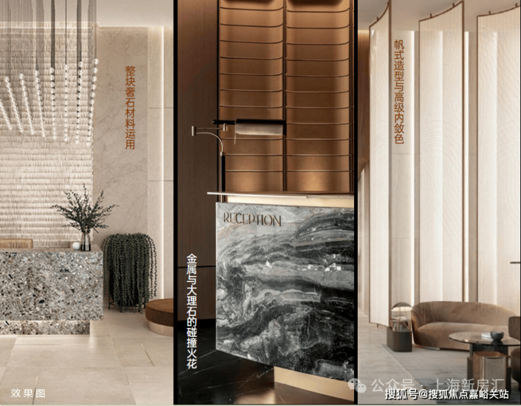 全新精筑 内奢于心的精工品质,建筑主体天然石材打造 品质出类拔萃;建筑立面为现代简约风格,干挂石材雕刻建筑经典,结合大曲率流线侧窗,从内部大堂到走廊公区,考究的用材与色彩搭配尽显海派摩登气质与豪宅质感奢华!