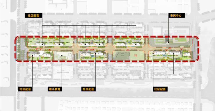 其中,一轴为生活街区轴,其聚合了文化活动室、生活服务中心、市民中心等丰富的公共空间,下楼可轻松享受到多元且丰富的邻里社交生活。
