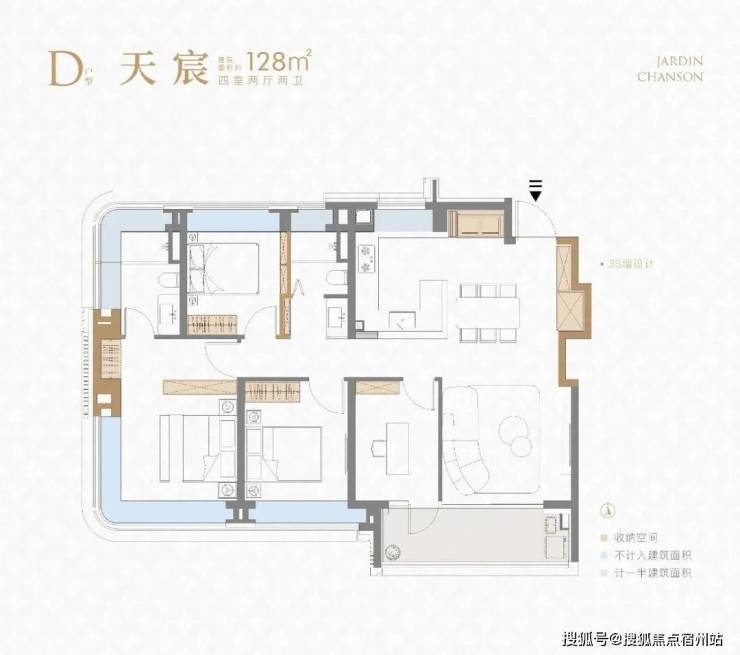 先看建面约101㎡边套户型,首先布局相当合理,三开间朝南+动静分区+客餐厅阳台一体化设计,采光、私密性和空间利用率全部拉满,3房2卫的配置也非常符合市场主流需求。