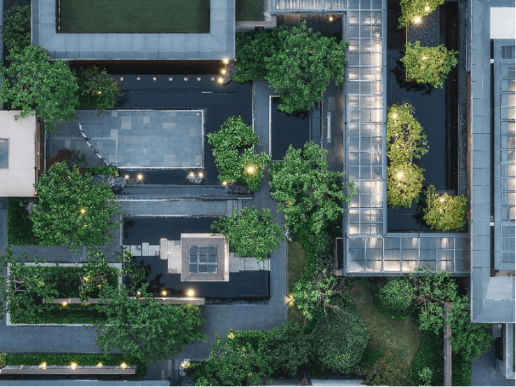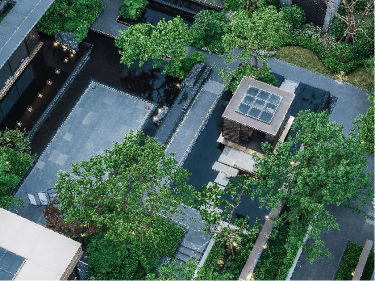 从空中俯瞰,跌水水景、亲水平台、色叶树阵等多重景观交融,展开一幅无与伦比的山水画卷。