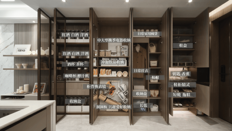 全屋收纳系统, 满足一家老小海纳空间!约2.25mx2.4m的超体量玄关柜,为生活扩容,可容纳约56个20寸行李箱,而玄关柜、岛台、卫生间镜柜、主卧衣帽间等空间,把更多隐藏空间打造成超级收纳功能,让未来的生活井井有条。