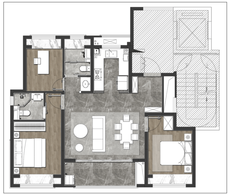 对于二人情侣,是安放衣物与家庭办公的温馨空间,衣帽间、书房、学习,充分满足二人生活的多元生活。面对三口之家,可以从婴儿房进阶为儿童房,伴随年龄结构的变化,而不断调整自己的定位。