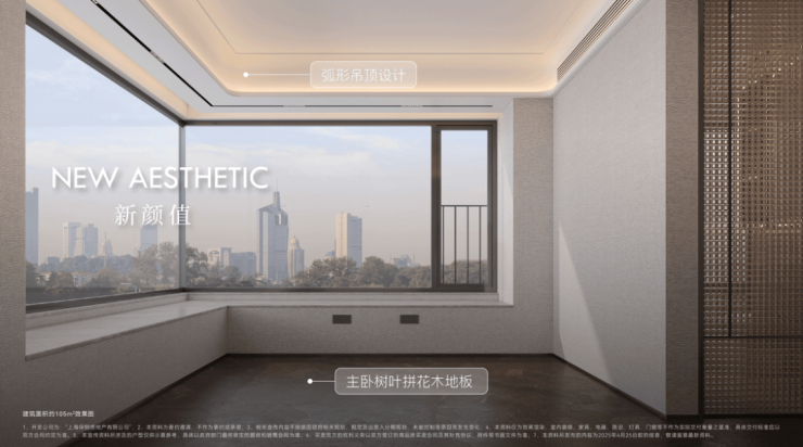 项目大量使用奢石设计,客厅四边弧形天花、主卧树叶拼花地板、精致优雅的骨骼线设计,都是开发商花费更大成本和耗材去呈现更美的视觉体验。