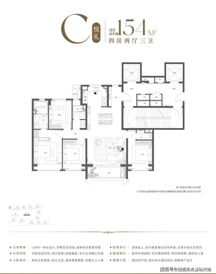 4房2厅3卫设计,整体格局方正,南北通透,四开间超14米奢阔尺度,阳光清风肆意流淌。约9.9米阔绰LDKB一体化空间,大尺度的竖厅设计,容纳多元家庭欢欣团聚。