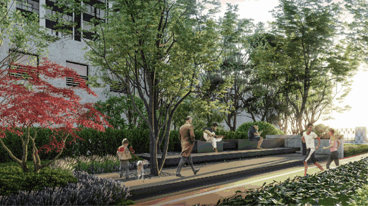 通过园林中曲径通幽的设计手法,布置景墙设计,引人入胜。社区内打造大树聚场、儿童乐园、阳光草坪、健身跑道等多个功能空间,依托架空层构建出更多的互动空间,扩展社区内的活力活动场域,为居者营造更多幸福生活的场景。