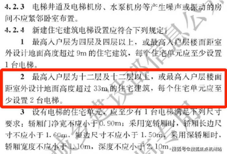 ② 5.1 起执行住宅新国标,最高入户层为十二层及十二层以上,或最高入户层楼面距室外设计地面高度超过33m的住宅建筑,每个住宅单元应 至少设置2台电梯。