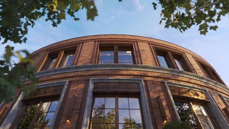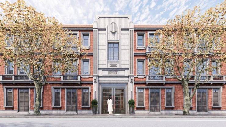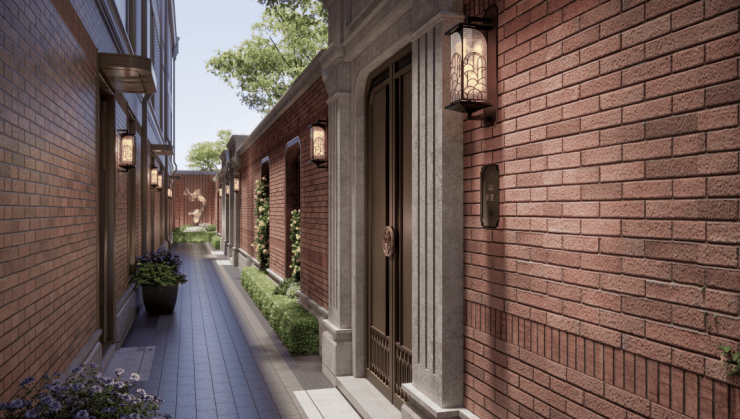 一幕为海派门仪,也是项目的主入口,约10.7米阔绰门庭尺度的海派里弄门楼界面,极致的对称仪式布局,延续建筑红砖肌理,甄选天然红洞石,还原那一抹隽永而厚重的经典色彩,既有大地般的沉稳,又透出低调的奢华感。