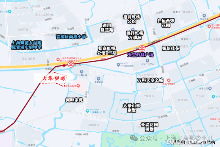 项目北侧紧邻17号线徐泾北城站(需绕行河道),1站可达徐盈路天空万科广场,2站至蟠龙古镇商业区,3站直达国家会展中心,4站即达虹桥枢纽。