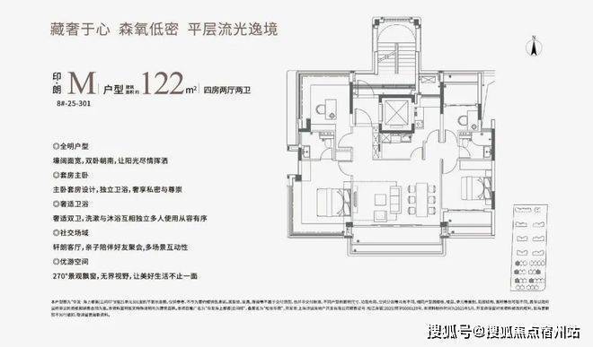 建面约122㎡的中叠四房,大平层式设计,宽尺横厅+阳台+270°主套飘窗采光条件极佳,每天早晨都被阳光晒醒。
