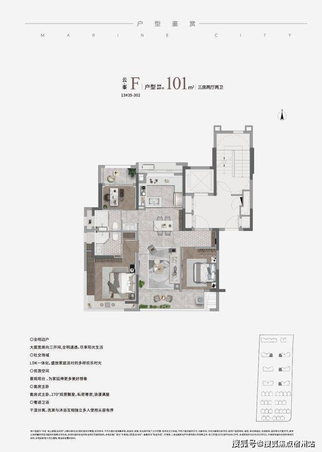 建面约91㎡的三房采用经典的飞机户型,南北通透,主卧带飘窗,晾衣服都能晒到太阳,适合当下年轻上班族对阳光和悦己体验的生活需求;