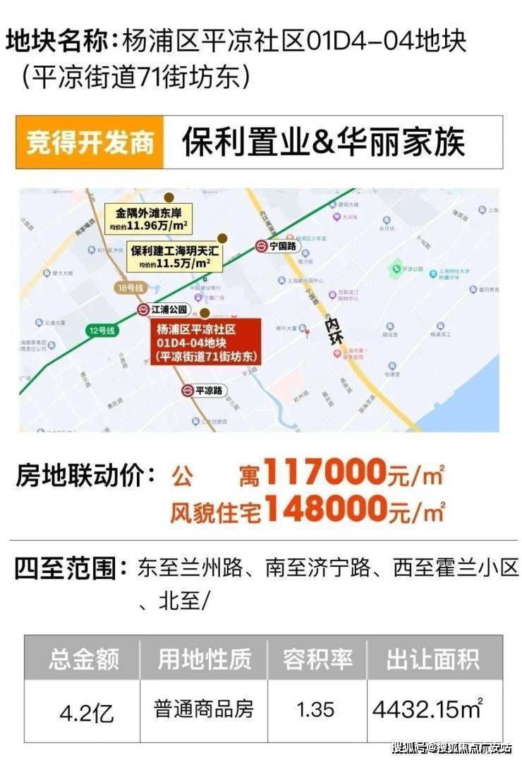 2023年12月5日,杨浦区平凉社区01D4-04地块(平凉街道71街坊东)以底价出让,华丽家族和保利置业联手拿下。该地块容积率1.35,高层联动价11.7万/㎡,风貌别墅联动价14.8万/㎡。