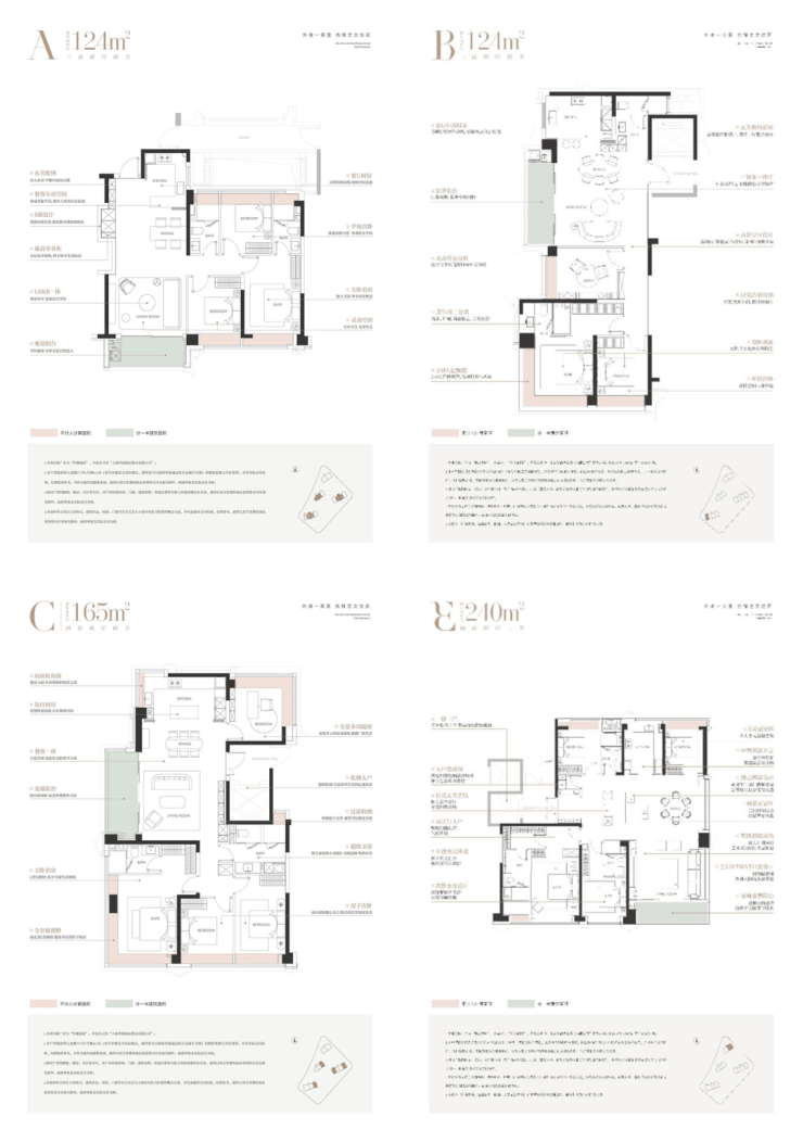 户型设计也适配多元需求:建面约240㎡户型有五进制主卧,约124㎡户型是全景舱概念,约165㎡户型为真四房,让空间真正服务生活。