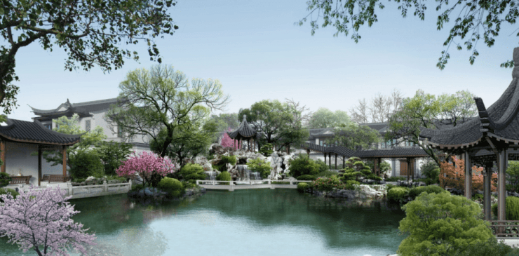 从外部来讲,上海桃花源拥享滨江壮阔之景,悦享“护城河”宁静之韵。从内部而言,上海桃花源大幅增加水景:东西两条水街,延承苏州平江古城水巷交错的江南风格。水街从中轴景观辐射,通过增加水景长度,延伸水景曲折性与丰富感,让水景更具东方园林之韵。同时,上海桃花源还打造水景两头的端景园林,以水带路、水路相生中,水随园生,园以水活。水景大幅增加后,家家有水景,别有一番意境。