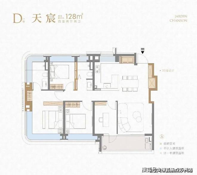 项目建面约128㎡4房户型延续了前作3S墙的设计,保证了收纳空间的丰富性。