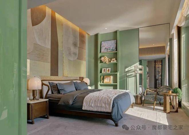 顶层下午茶区以淡绿为底,壁炉暖光漫过手绘地毯的肌理,将社交场域沉淀为冥想容器;主人房墙面缟玛瑙(Onyx)的天然流痕,也与一层屏风暗纹形成时空对位,光影在矿物晶体中生长出私密的诗。