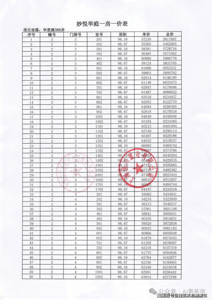 项目一房一价表▼