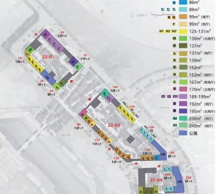 其中:22-01地块占地面积1.1万平方米,总建筑面积5万平方米,包括4栋住宅楼、2栋商业;22-03地块占地面积1.6万平方米,总建筑面积6.7万平方米,包括7栋住宅楼、2栋商业;22-04地块占地面积0.9万平方米,总建筑面积3.8万平方米,包括3栋住宅楼、2栋商业。
