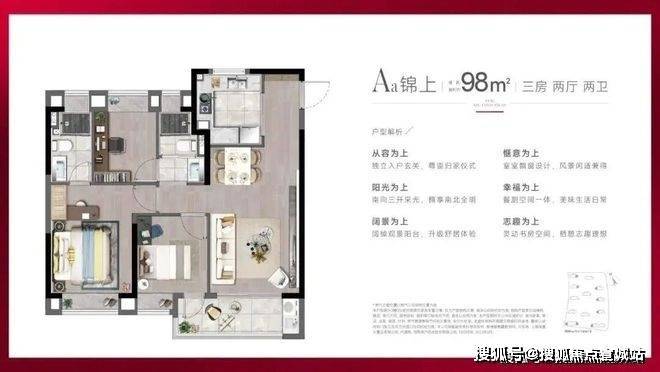 建面约98㎡3房2厅2卫户型,分别是边套、中间套,满足不同人群的居住需求。