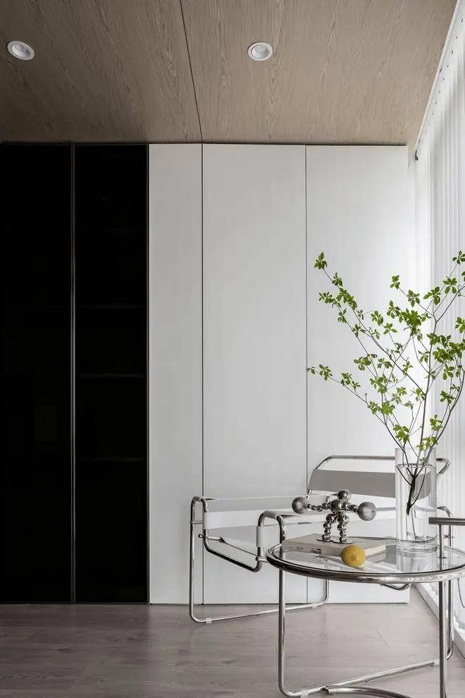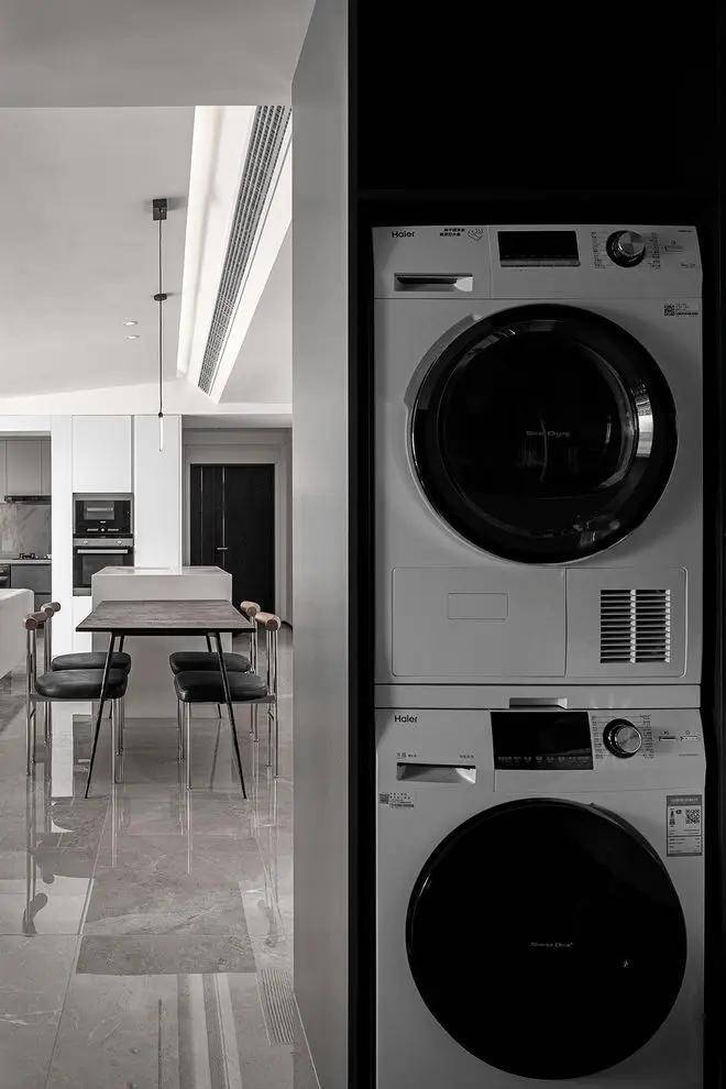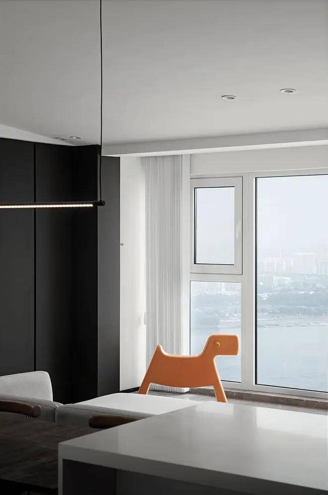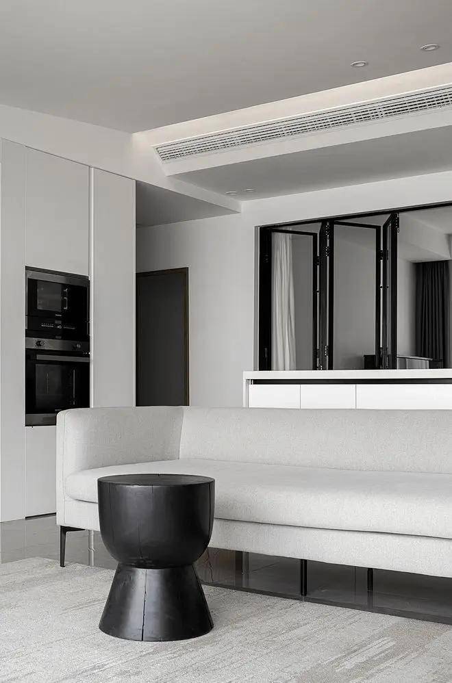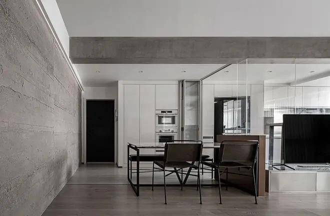 另一个空间亦秉持现代简约的设计理念,以黑白灰为主色调,简洁的线条与纯粹的美感在此空间中交织。客餐厨的无缝衔接设计,不仅让空间更显通透宽敞,更凸显了设计师的匠心独运。餐桌与岛台的紧密结合,黑与白的经典对比,无不展现出设计师对细节的极致追求与对简约美学的深刻理解。