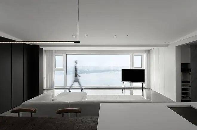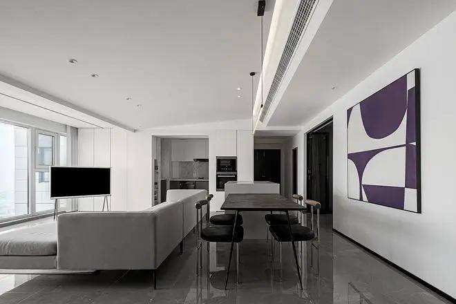 Another space adheres to the modern minimalist design principle, with a black, white, and gray color palette. Clean lines and pure aesthetics coalesce in this space. The seamless integration of living, dining, and kitchen areas not only enhances the openness and spaciousness but also highlights the designer's meticulous attention to detail and profound understanding of minimal aesthetics.