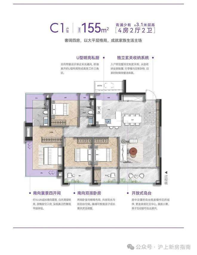 精工品质:项目层高起步即达3.1米,部分大户型更达3.3米,空间感优越 。精装标准对标高端项目,选用唯宝智能马桶、铸铝门等品牌建材 。