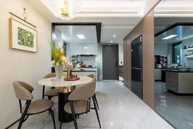 客餐厅一体化,外接南侧半封闭阳台,整体视野开阔,尺度阔绰,空间利用率非常高。注意看室内门以及玄关柜,全部都是直通到顶的设计,让视觉更加统一,简洁大气!