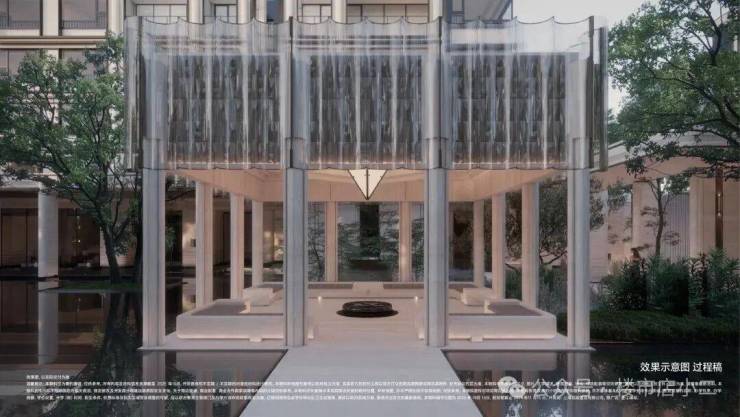 项目打造了约150米的超级城市界面,远超区域内61米的平均水平。社区中央是一个约1200㎡的“镜面水景”庭院,配合精选的乌桕林,营造出“无界交融”的景观氛围。