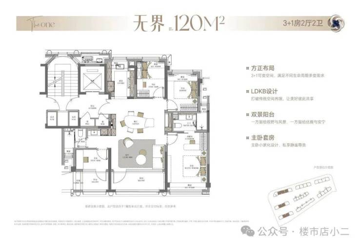 约120㎡的“3+1”房,是面向首改家庭的“全能选手”。它拥有约4.8米的南向开间,客厅连接着宽景阳台。特别设计的“X空间”可以灵活改造为书房、儿童游戏区或储藏室,适应家庭不同阶段的需求变化。