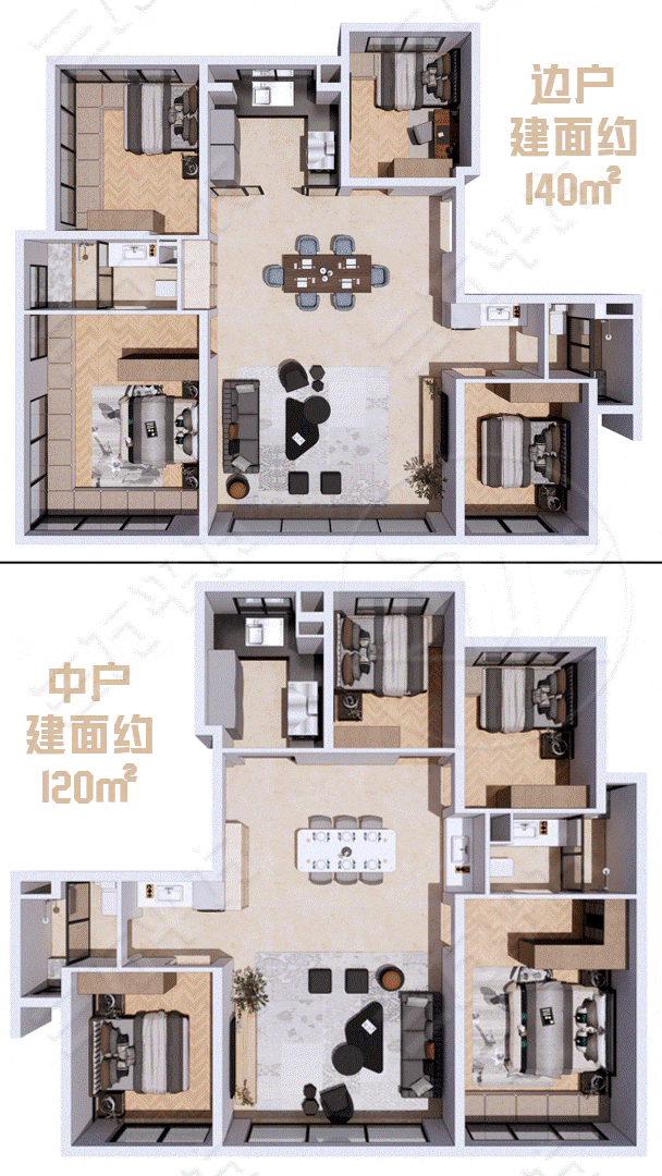 两种户型都采用了 “四叶草”布局,让每个卧室都相对独立,互不干扰。这种设计在现代多代同堂的家庭中尤为实用,既保证了家庭成员的互动,又尊重了每个人的私密空间。