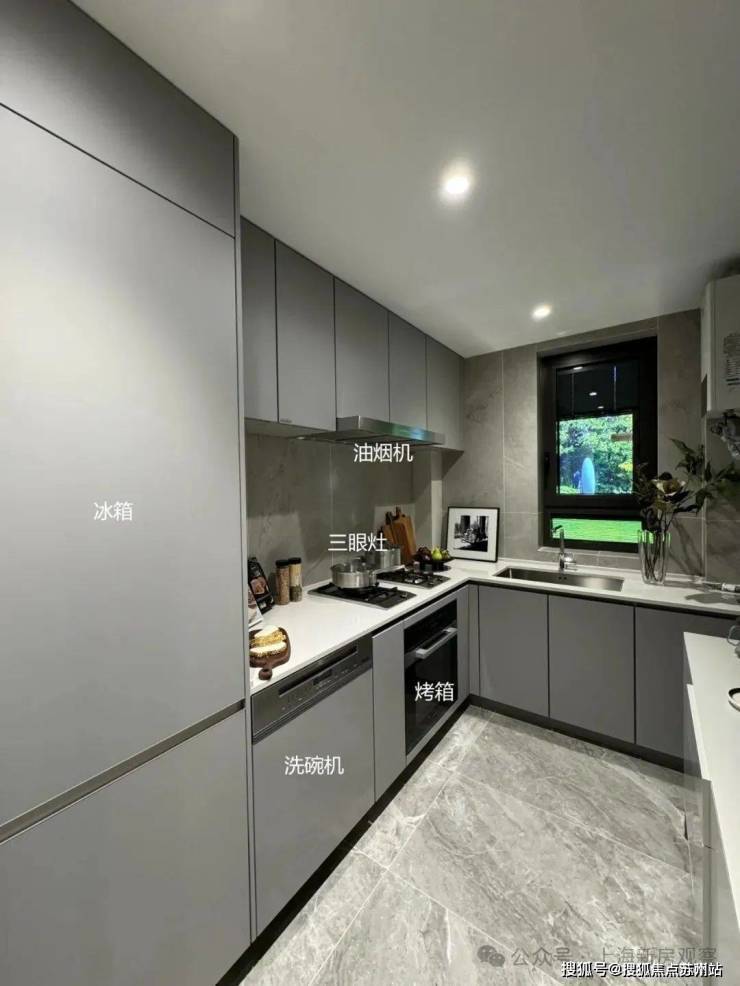 再看关键的厨房,大大的LOGO显示着——全进口的米勒6件套是没跑的,油烟机、灶台、蒸烤一体机、洗碗机还有单门的冰箱。