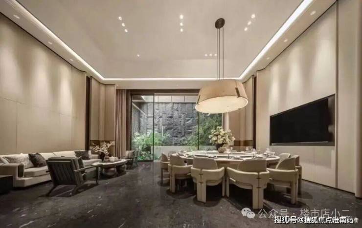 首先能看到超大南向绿地花园,与客餐厅连为一体。这个边套户型,还带有侧向绿地花园,巨大的L型庭院,家庭聚场、静谧花园、亲子互动皆随心所欲。