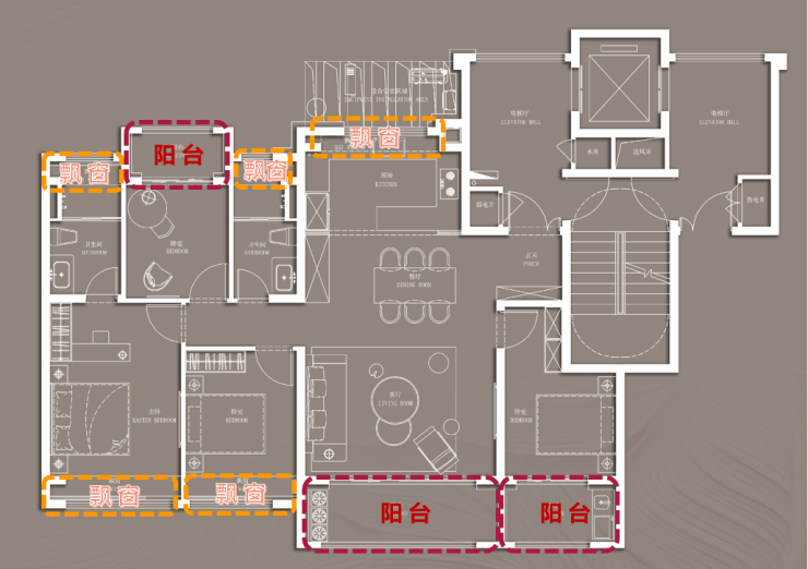 赠送面积(一半阳台+全屋飘窗+类独立电梯厅):约22.5㎡!