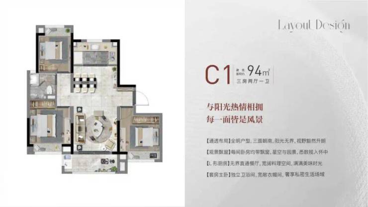建面约99㎡3房2厅2卫,做到了三开间朝南+动静分离+南北通透+双卧室朝南+主卧套房设计+明厨明卫,室内通透明亮。