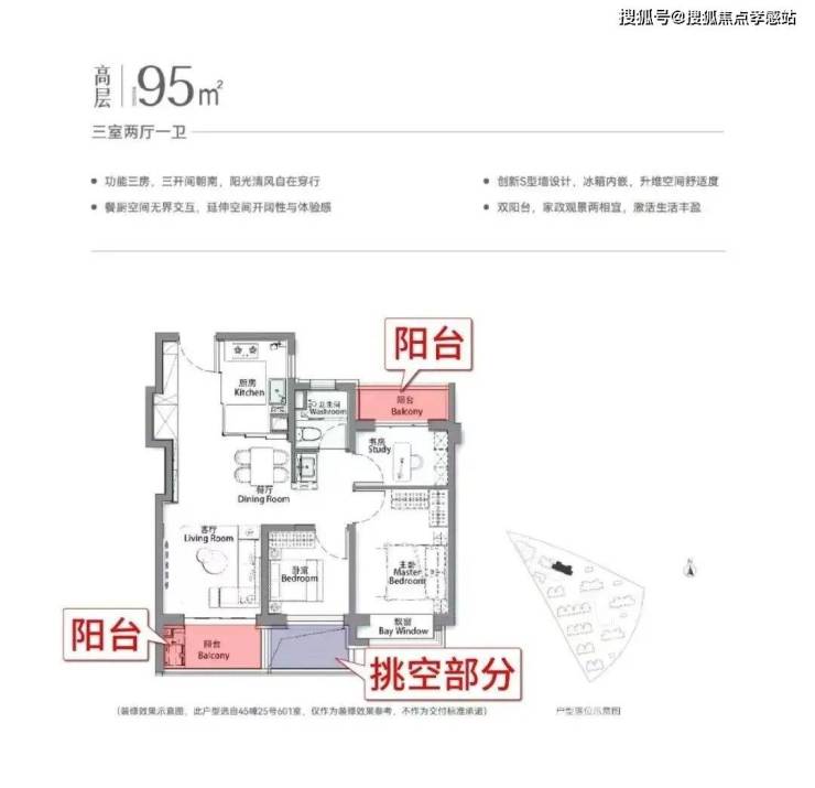 再加上南向大面宽短进深、全卧飘窗、L型转角阳台设计,哪怕小户型89㎡3房,尺度感都超棒,采光和视野更是一流。