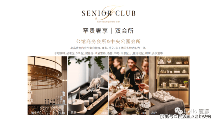 中央公园会所和公馆商务会所,中央公园会所里面有泳池、健身房、瑜伽室、儿童游乐园和休息区;而公馆商务会所则是上流社会的社交场,有咖啡区、品茗区、spa区、红酒雪茄、ktv、会议室私宴厅等。
