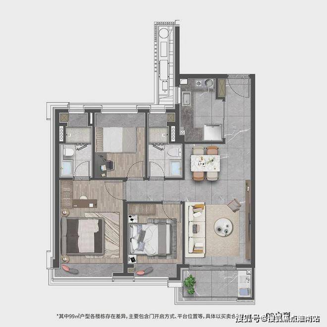 建面约99㎡的三房设计,在空间上使用功能更加多样化,一站式解决了家庭生活的所有功能,优化居家动线,大大提升空间的居住体验.
