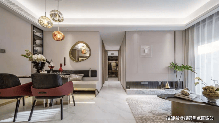 入户四合一智能门锁,全屋通高门,玄关柜柜体加长、板防变形拉直器、活动层板设计,餐客厅卧室双眼皮吊顶等,均极具巧思,更符合当代人的生活习惯。