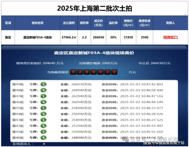 3月3日,上海2025第二批次土拍,经过49轮竞价,招商蛇口以266030万元的总价摘得嘉定新城远香湖F03A-4地块,溢价率30%,成交楼板价约31850元/㎡。