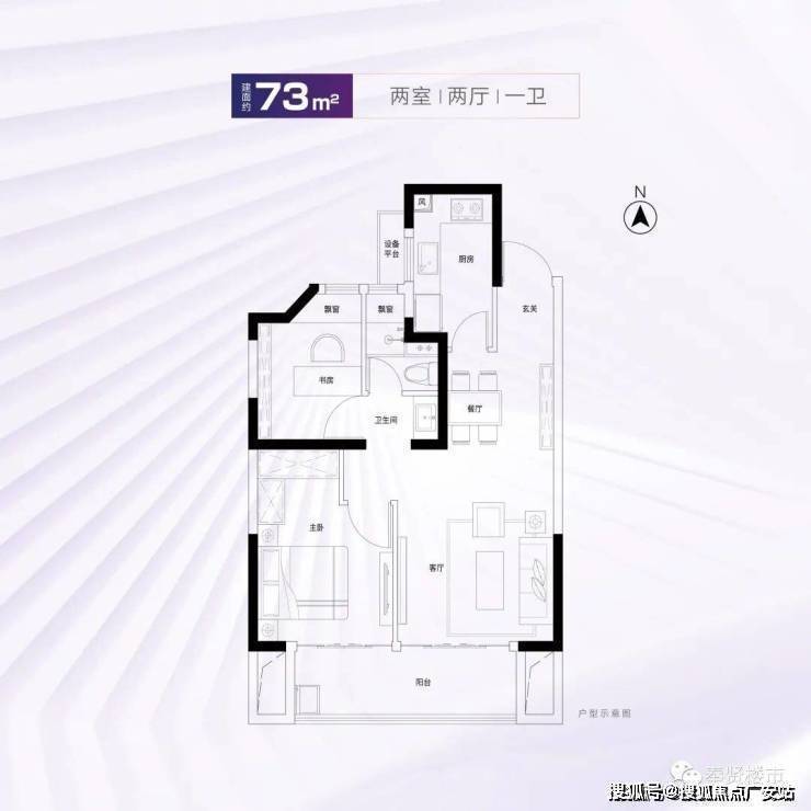 约73平精致两室户型,客厅面宽由3.2米升级到3.65米,舒适度更佳,北卧房间面宽到达2.5米,实用性更强。