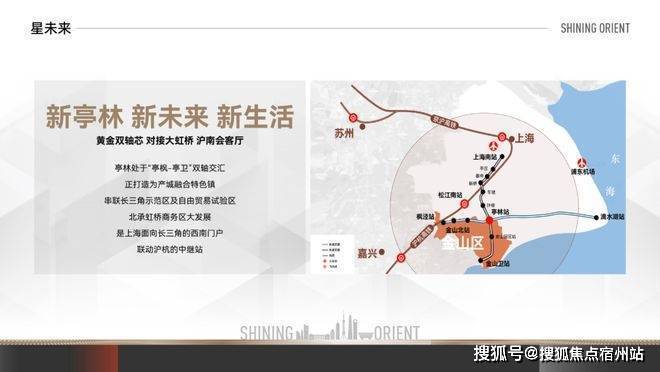 双轨加持——距离金山铁路亭林站约2.5km,5站到上海南站,轨交南枫线(规划)串联上海南部客流主动脉