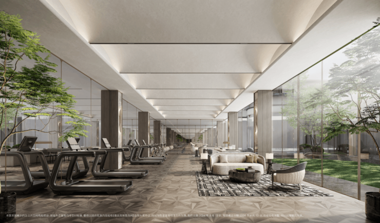 3、搭载大落地窗环模设计的健身房,在欣赏窗外景色的同时,高端的健身器材,丰富的健身配套,都可以满足业主日常的健康所需。