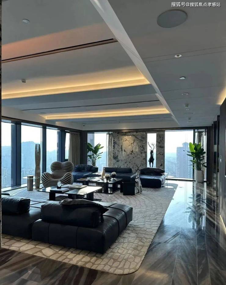 该户型呈三梯一户的设计,同样是约3.6米的奢阔层高,朝南横向跨度超37米,会客厅面宽超18.5米,空间奢阔;户型东、南、西三面全景玻璃幕墙,超270度环幕视野景观震撼!